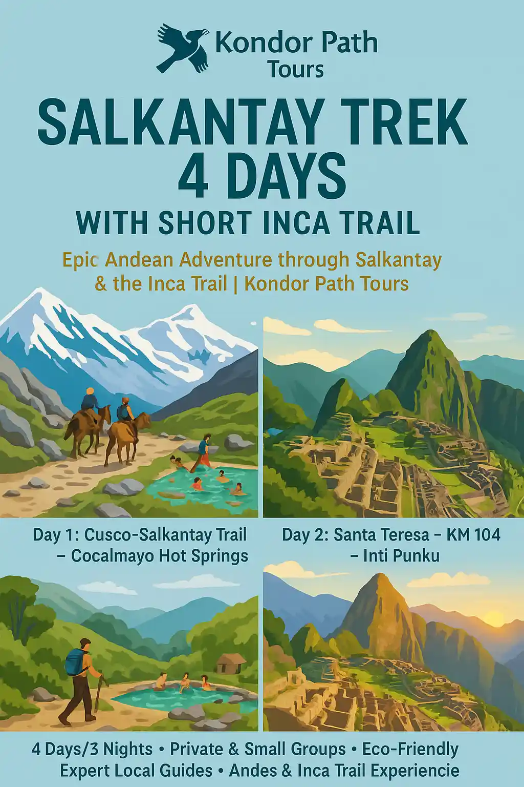 Enjoy the amazing trek on the Salkantay 4-Day Trail. Plan your adventure to Machu Picchu with KONDOR PATH TOURS.